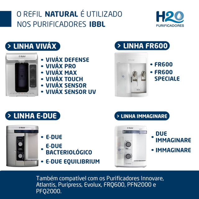 | Compatibilidade | O Refil Natural C+3 é utilizado nos purificadores IBBL: Atlantis, Evolux, Immaginare, FR 600, FRQ 600, FR600 Speciale, FR600 Exclusive, FR600 Expert, FRQ600 Expert, PFN 2000, PFQ 2000 e PDF. |